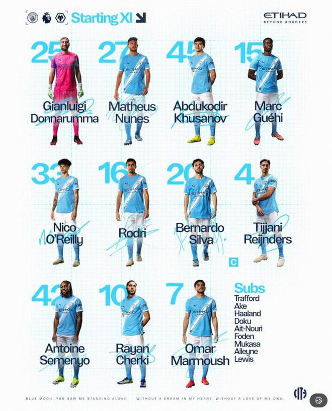 替補:1-特拉福德、6-阿克、9-哈蘭德、11-多庫、21-艾特-努里、47-福登、63-穆卡薩、68-阿萊恩、82-里科-劉易斯