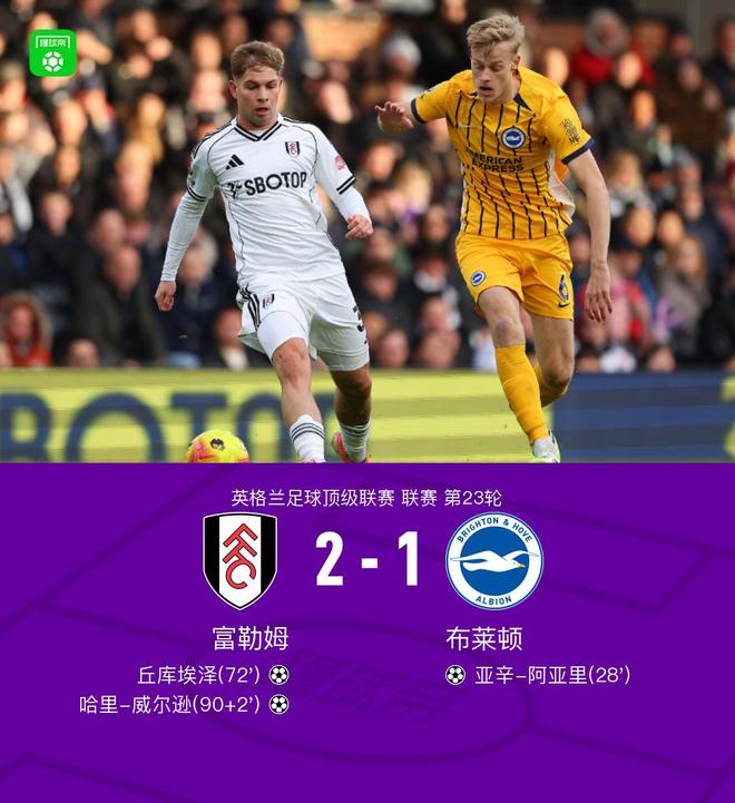 北京時間1月24日,英格蘭足球超級聯(lián)賽第23輪,富勒姆主場對陣布萊頓。亞辛-阿亞里率先破門,為布萊頓取得領(lǐng)先;隨后丘庫埃澤扳平比分;補時階段,哈里-威爾遜完成絕殺。最終富勒姆以2比1戰(zhàn)勝布萊頓。