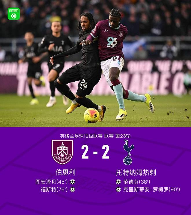 北京時(shí)間1月24日,英格蘭足球超級(jí)聯(lián)賽第23輪,伯恩利主場(chǎng)對(duì)陣托特納姆熱刺。上半場(chǎng),范德芬打破僵局。沃克傳中,圖安澤貝扳平比分。下半場(chǎng),福斯特破門幫助伯恩利反超比分。比賽尾聲階段,羅梅羅沖頂完成絕平。全場(chǎng)比賽結(jié)束,熱刺2-2戰(zhàn)平伯恩利,遭遇英超聯(lián)賽連續(xù)5輪不勝。