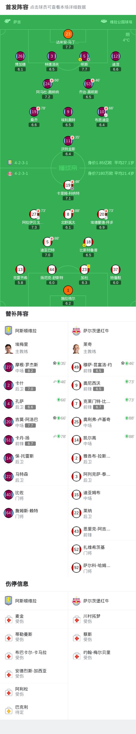維拉3-2逆轉(zhuǎn)薩爾茨堡紅牛直接出線,明斯破門,羅杰斯建功