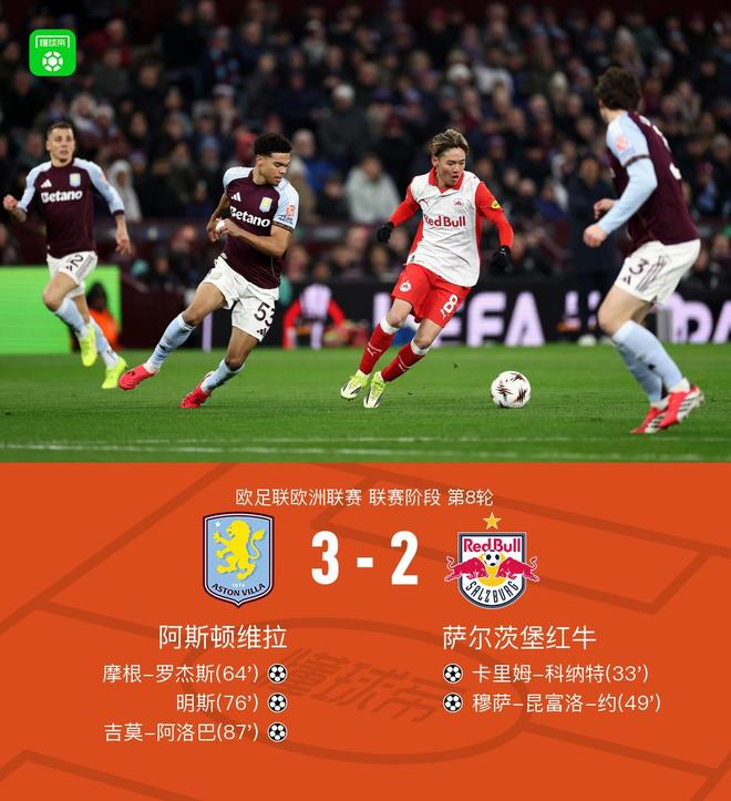 北京時(shí)間1月30日歐足聯(lián)歐洲聯(lián)賽 聯(lián)賽階段 第8輪,阿斯頓維拉對陣薩爾茨堡紅牛。上半場卡里姆-科納特破門,下半場穆薩-昆富洛-約擴(kuò)大比分,摩根-羅杰斯扳回一球,明斯扳平,吉莫-阿洛巴反超。最終比分阿斯頓維拉 3-2 薩爾茨堡紅牛獲第二名直接出線。